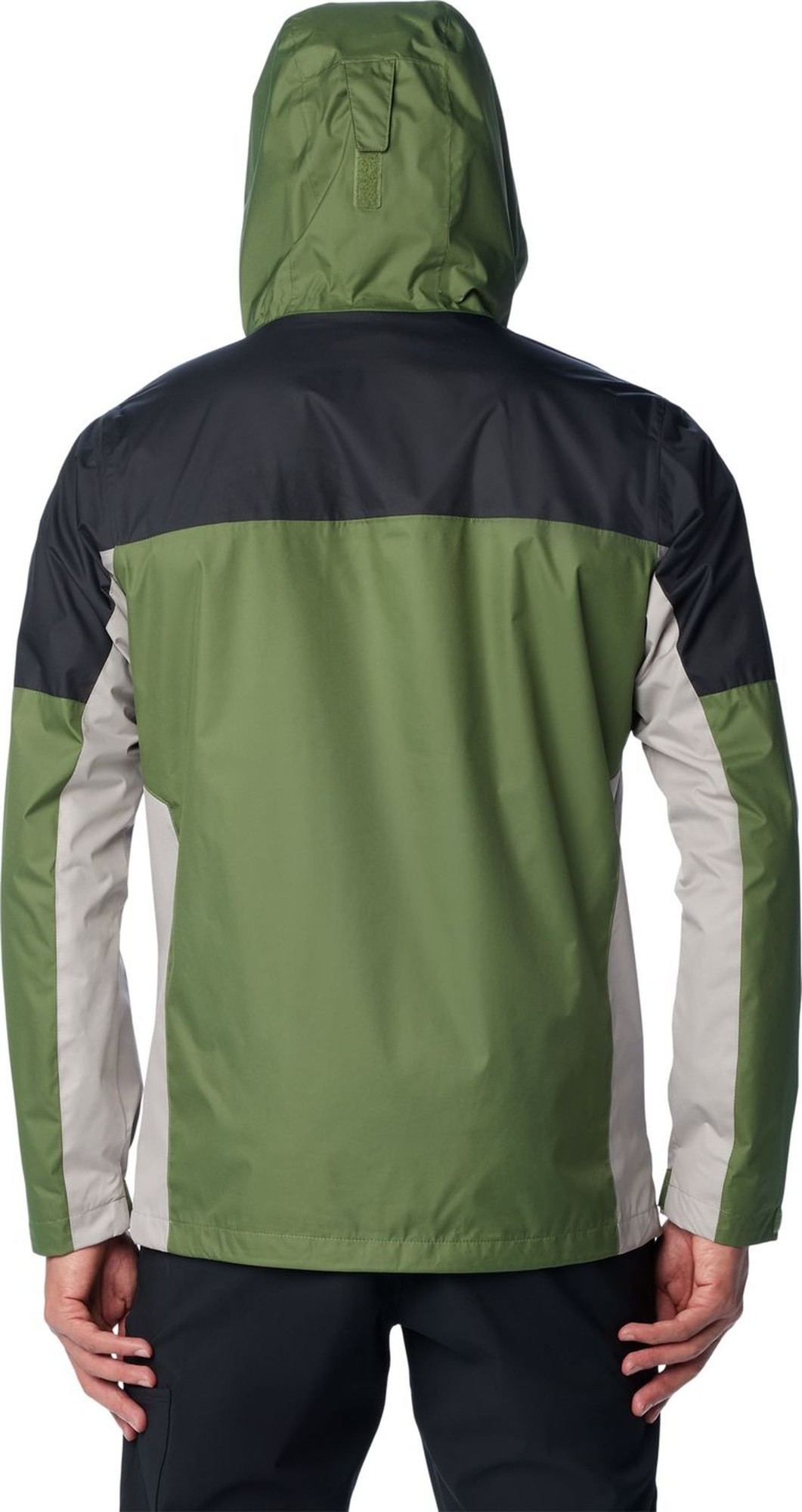 The hooded design is finished with adjustable details for a personalised fit and can be packed away into its pocket when the weather clears.
