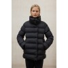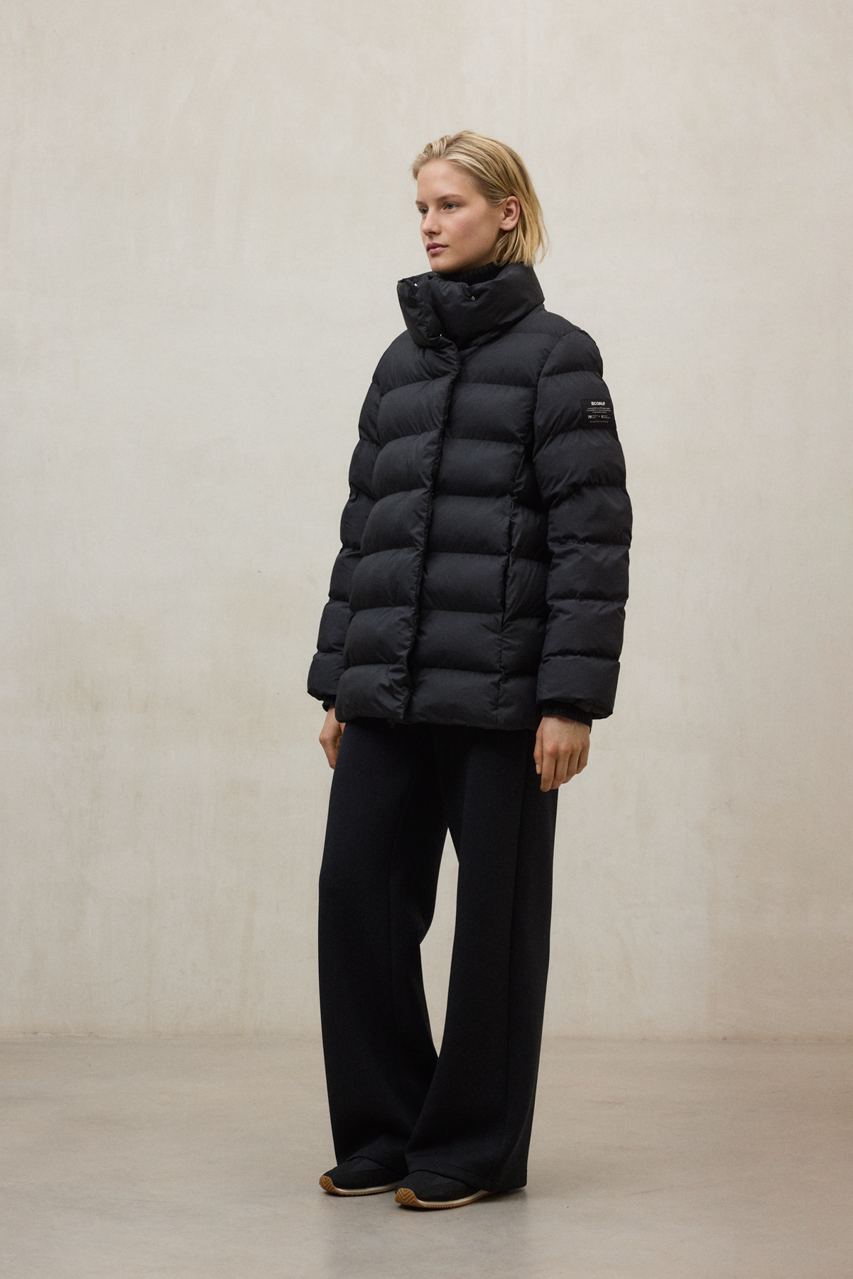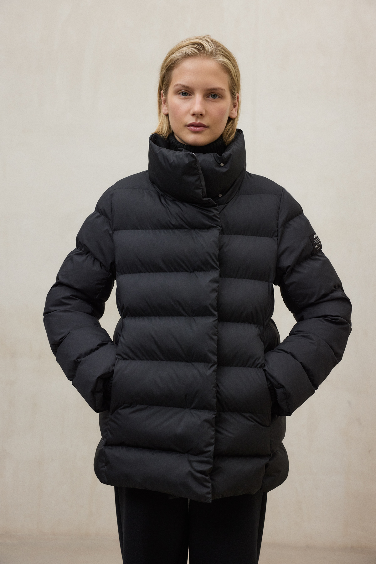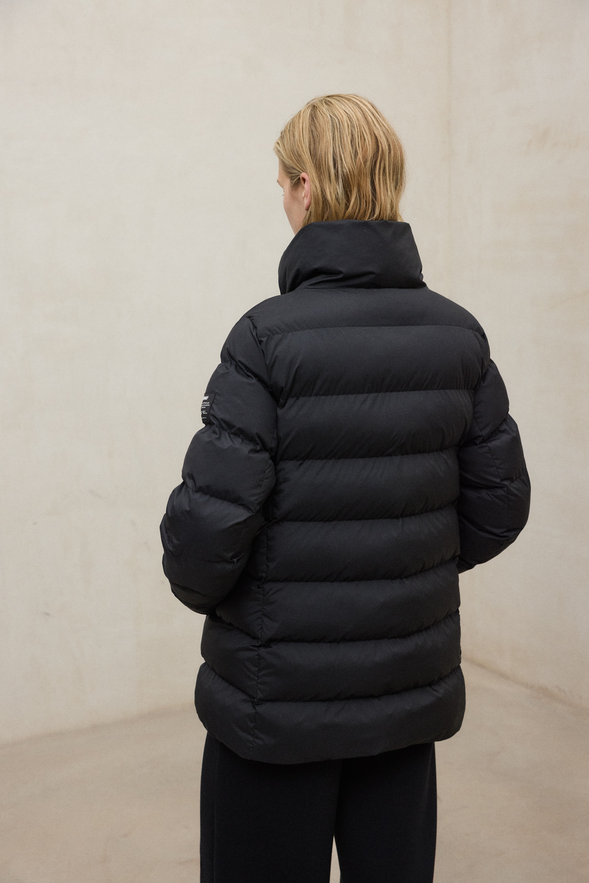 The Moore jacket is made of 100% recycled polyester, with a 100% recycled polyester lining and 100% recycled PrimaLoft® polyester filling. Recycled polyester helps reduce fossil resource consumption, CO₂ emissions, and water and energy use by reusing plastic waste such as PET bottles, while maintaining the qualities of virgin polyester. With its relaxed design, stand-up collar, and concealed seam pockets, this jacket combines elegance with functionality.