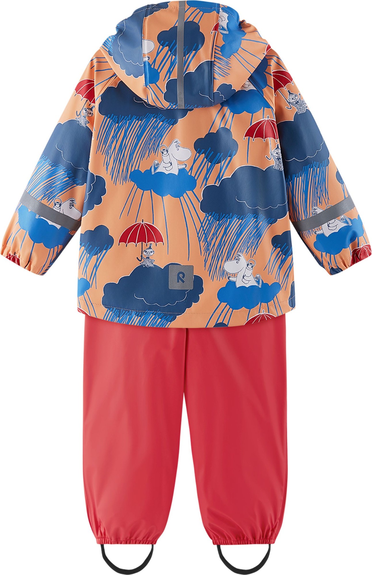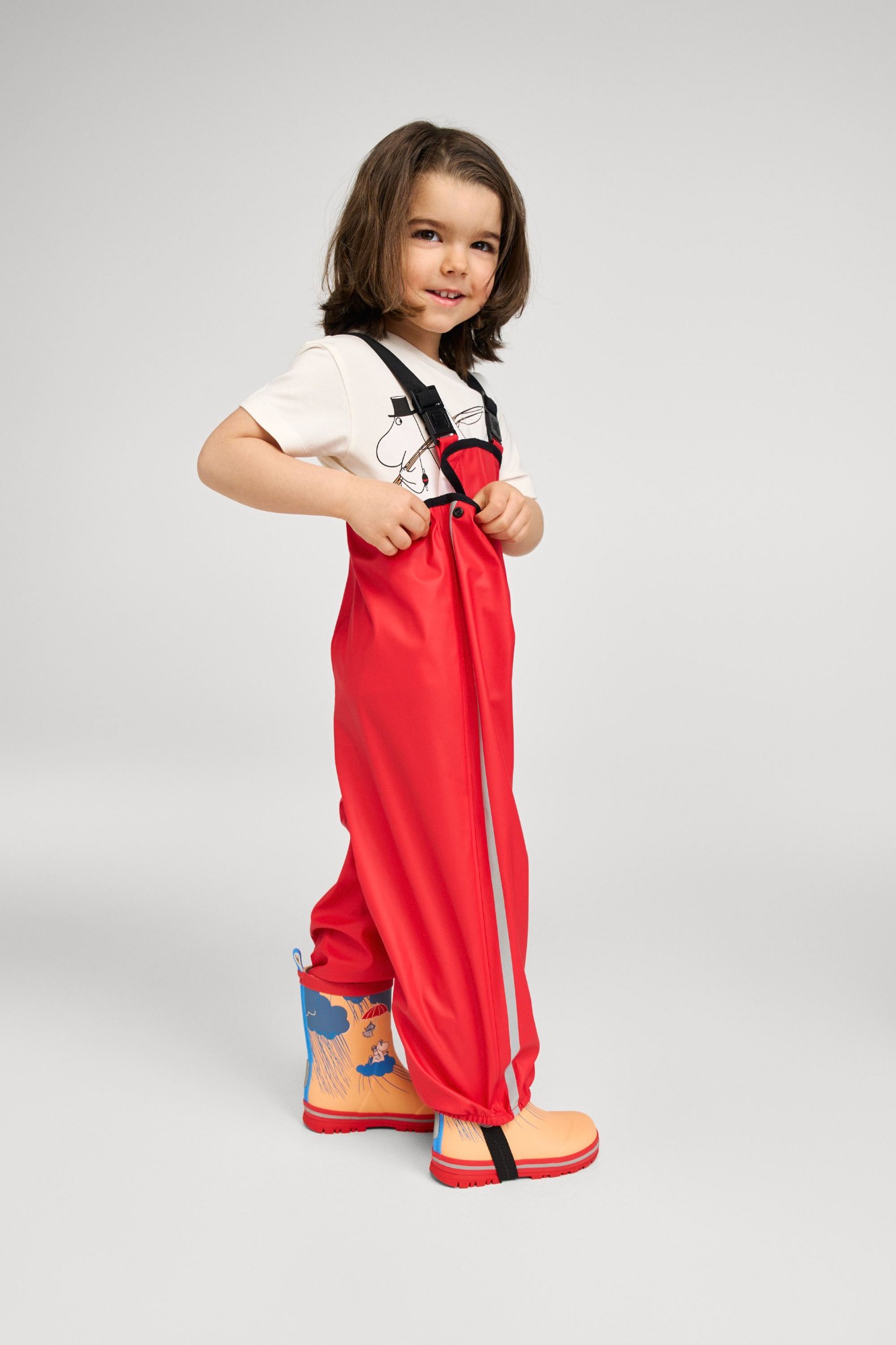 This unlined toddlers' rain outfit is great for wet days in spring and autumn. When you add warm layers underneath, it'll protect little ones even during the chilliest weather. Welded, waterproof seams guarantee that no rain comes through to your little one's skin under this kids' waterproof suit. The detachable hood not only protects from drizzle but also safely comes off if it gets caught on something when children are playing outdoors. The pants stay up thanks to the elasticated, adjustable suspenders and the removable foot loops are easy to pop under rubber boots or waterproof trainers to keep hems in place. All Reima children's rain gear is made from a flexible, PVC-free material.