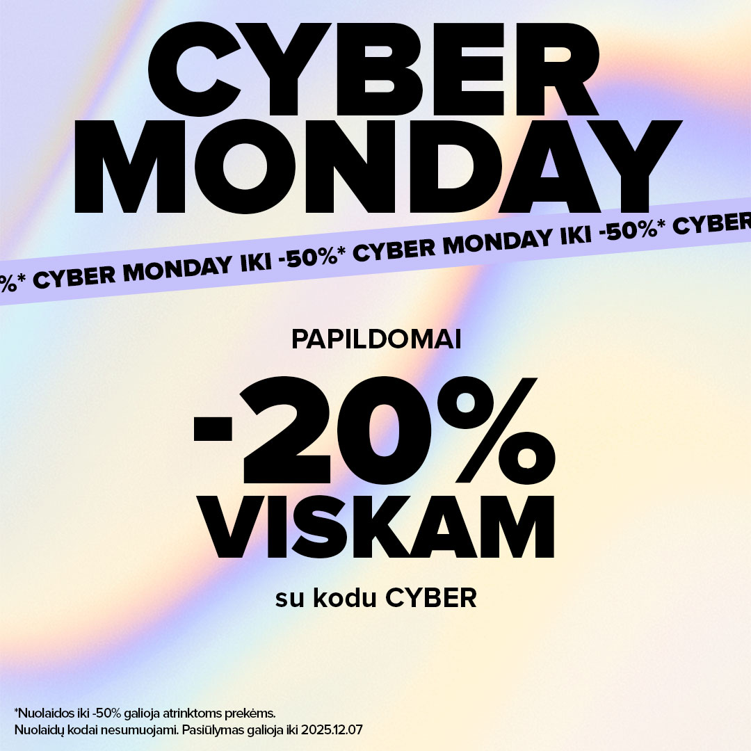 - Iki 50% ir -20% papildoma nuolaida viskam su kodu: CYBER. Pasiūlymas galioja iki 2025 12 07.