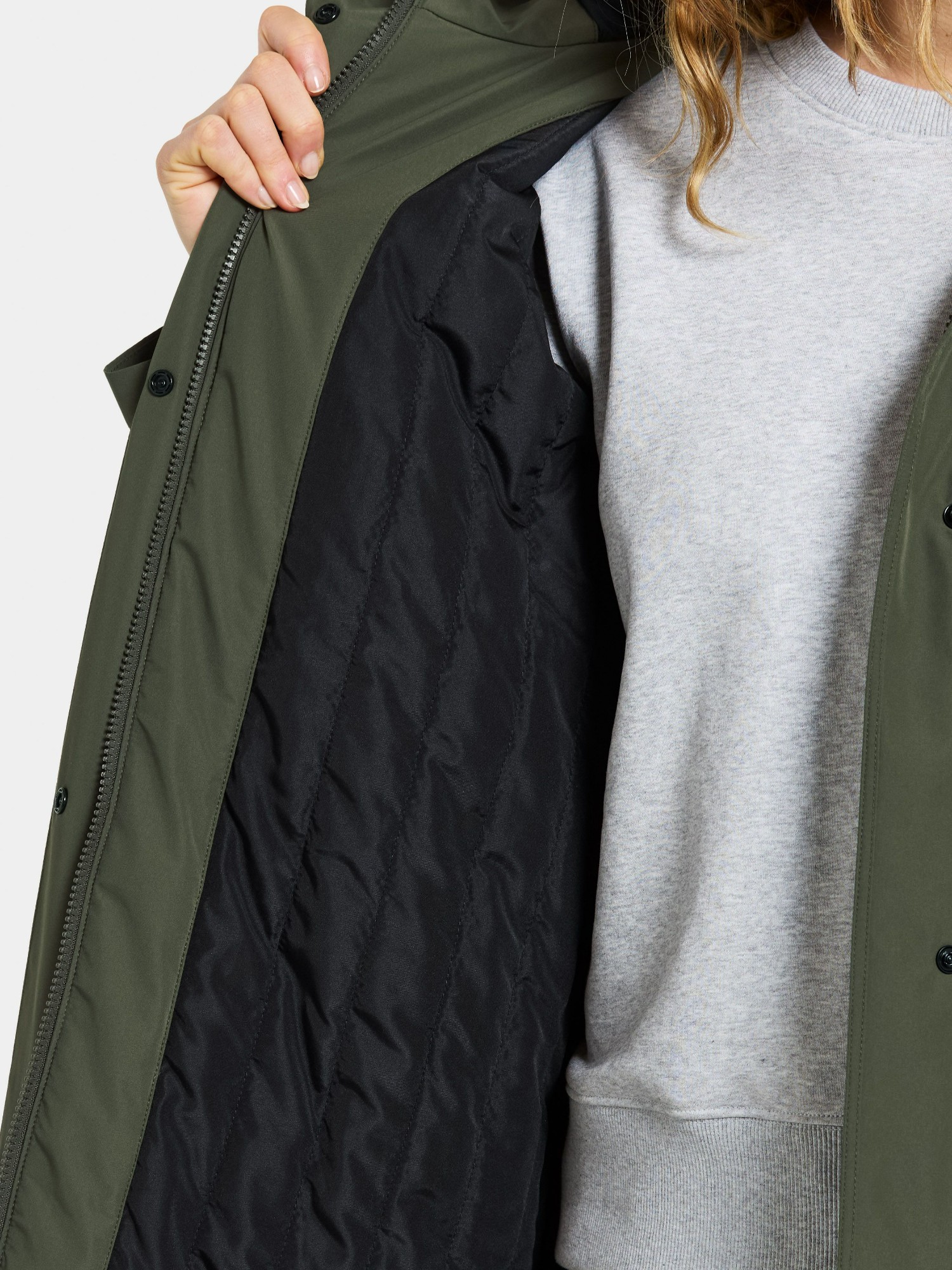 Priekyje – dvipusis užtrauktukas su sagomis uždengiančiu atvartu, suteikiančiu dar geresnę apsaugą nuo oro sąlygų. Elastingi vidiniai rankogaliai neleidžia patekti šalčiui, o praktiškos užtrauktuku užsegamos kišenės leidžia saugiai laikyti daiktus. Dėl išmanios apykaklės konstrukcijos užtrauktukas niekada nesiliečia prie smakro, todėl striukė dar patogesnė.