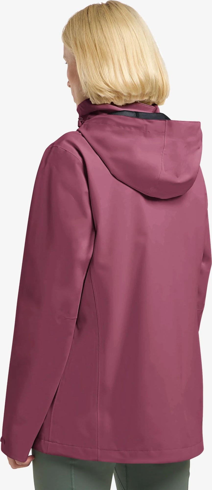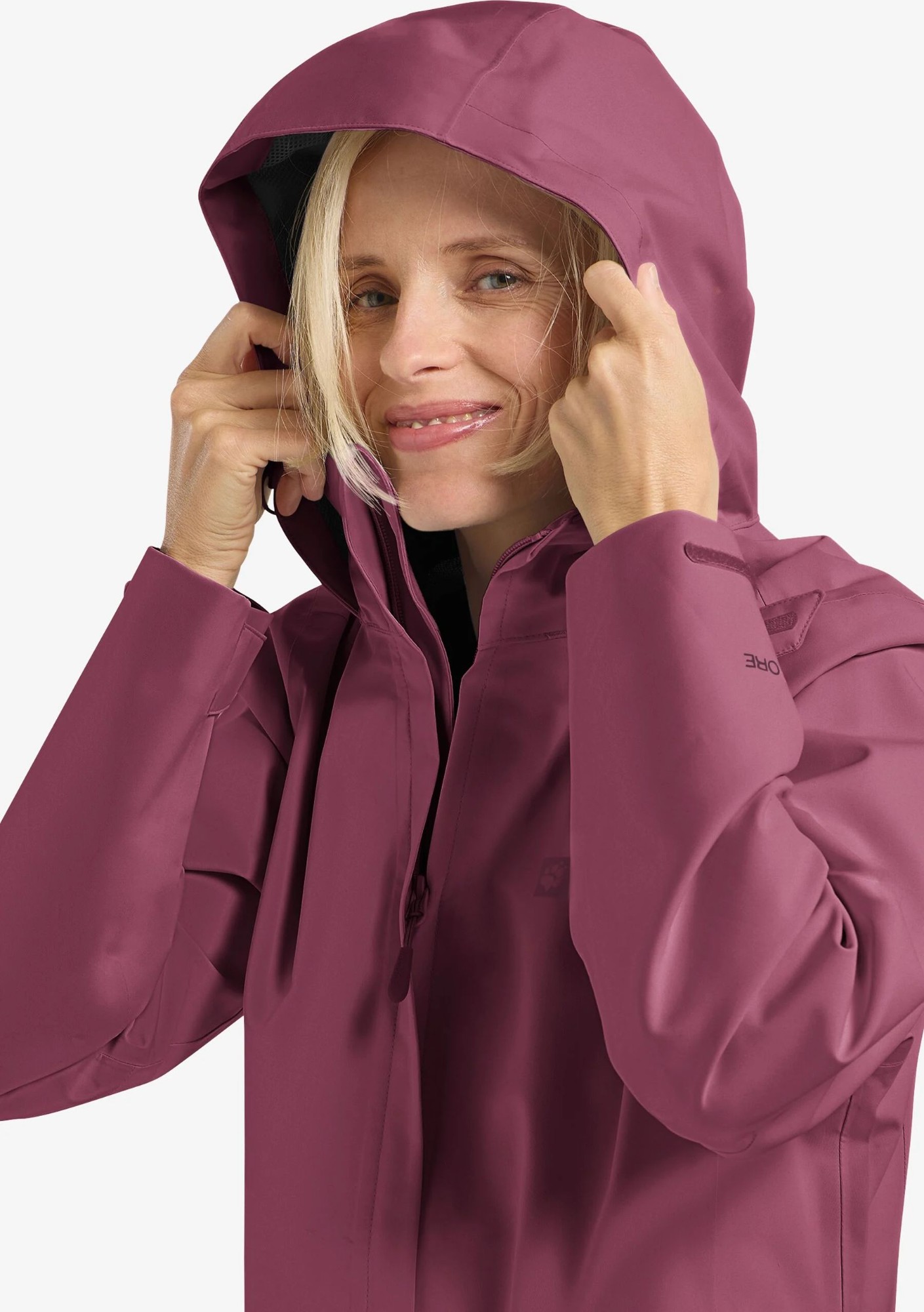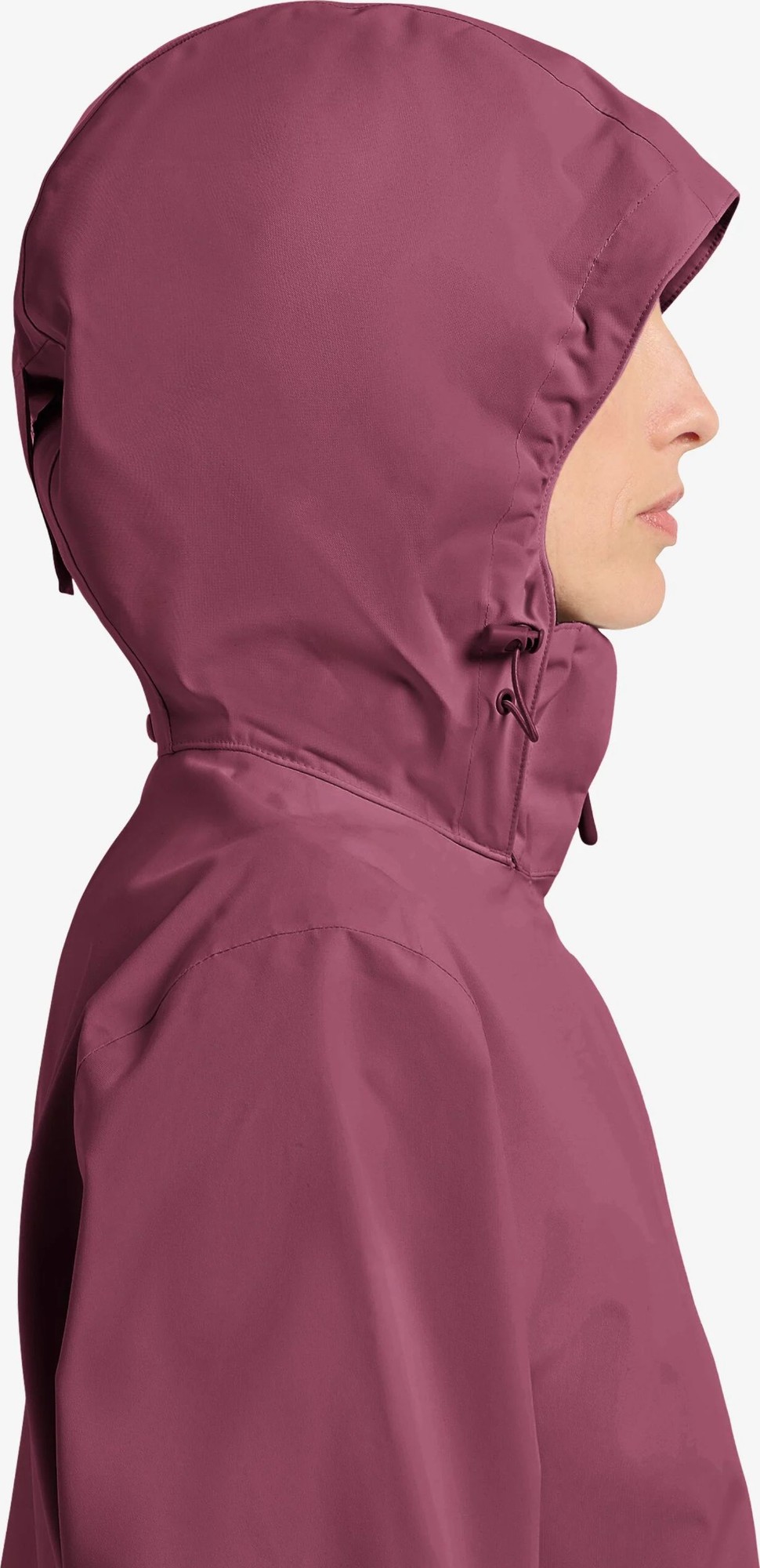 Women’s waterproof rain jacket with hood.