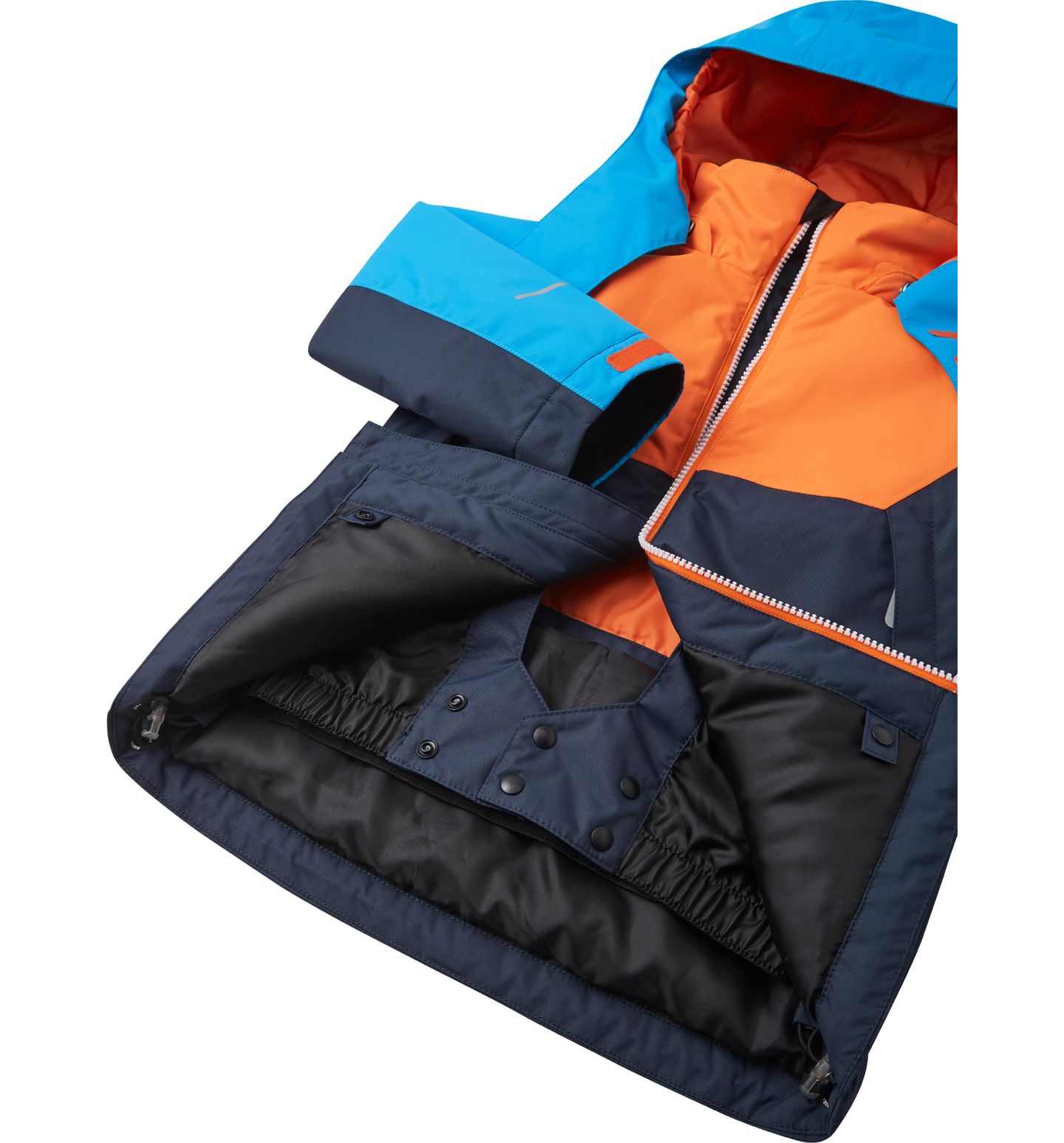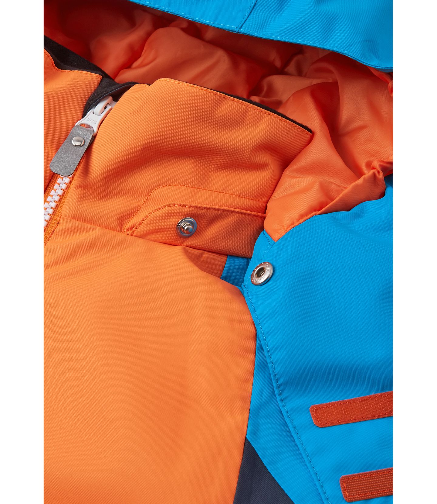 All the seams are sealed on this Reimatec children's ski jacket to make sure it's entirely waterproof. The material with recycled fibres is water- and windproof, yet breathable. Thanks to the smooth, recycled content lining, this kids' winter jacket easy to wear and feels comfortable even when teamed with warm mid-layers. It's equipped with an adjustable hem and cuffs for additional protection. The powder skirt keeps snow at bay and can be attached to a special place in the lining when not in use. The detachable and adjustable hood is safe because it comes off easily if caught on something. It also has a neck-protecting wind flap and visor. The jacket is finished with a convenient ski pass pocket on the sleeve. It can also be tumble-dried to quickly be ready to hit the slopes again.