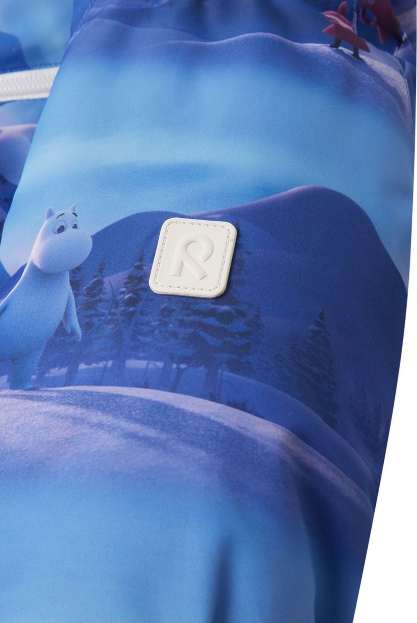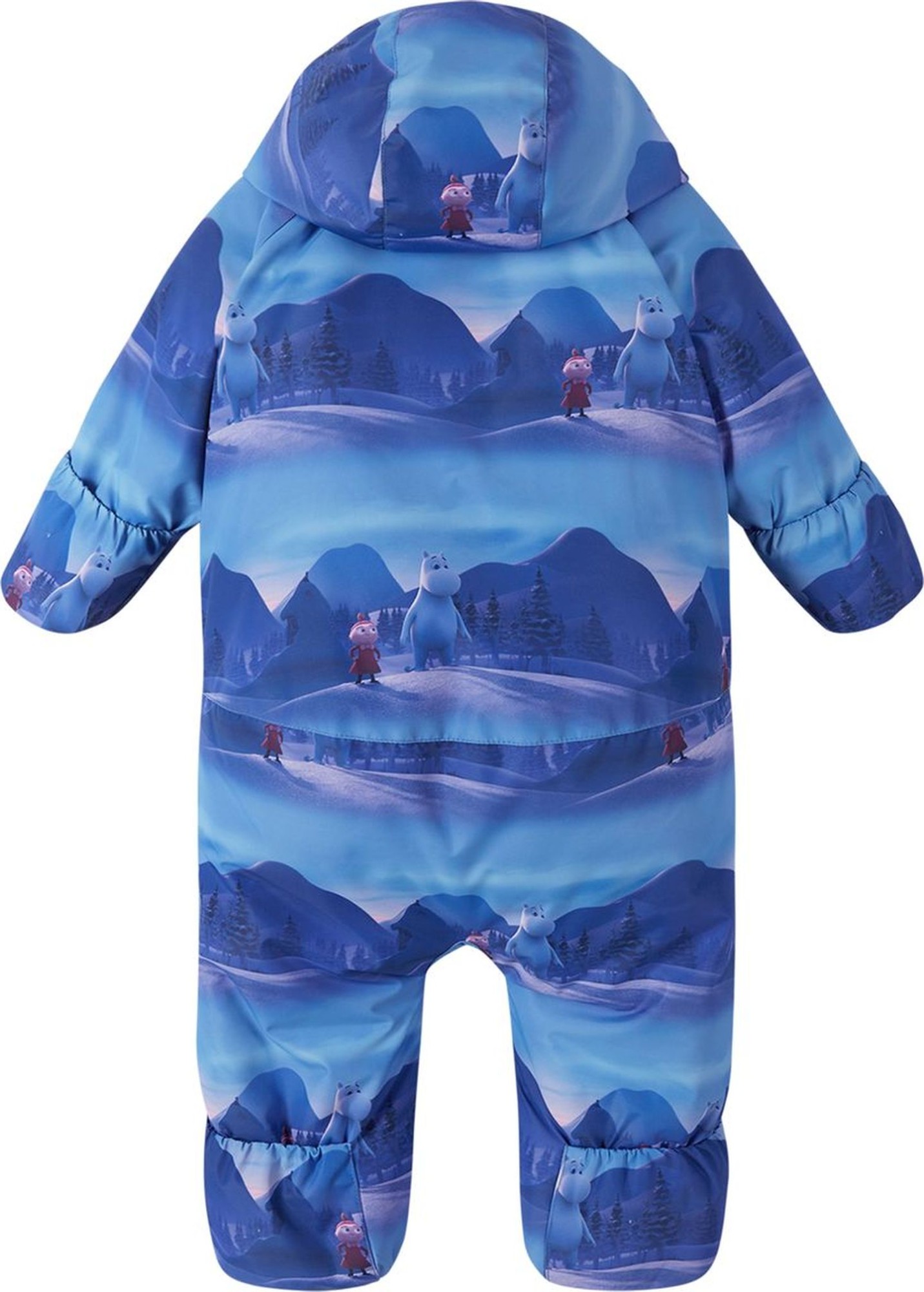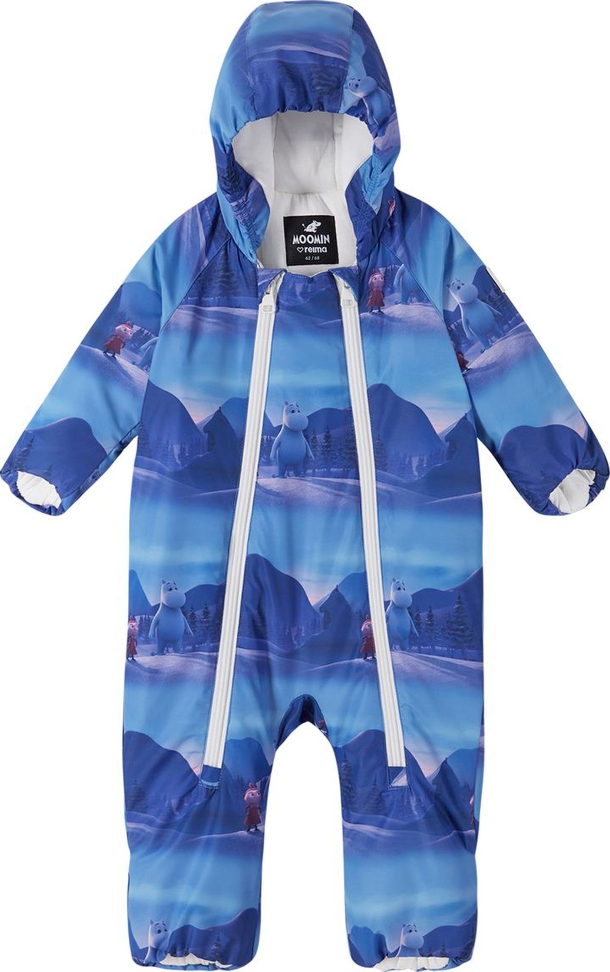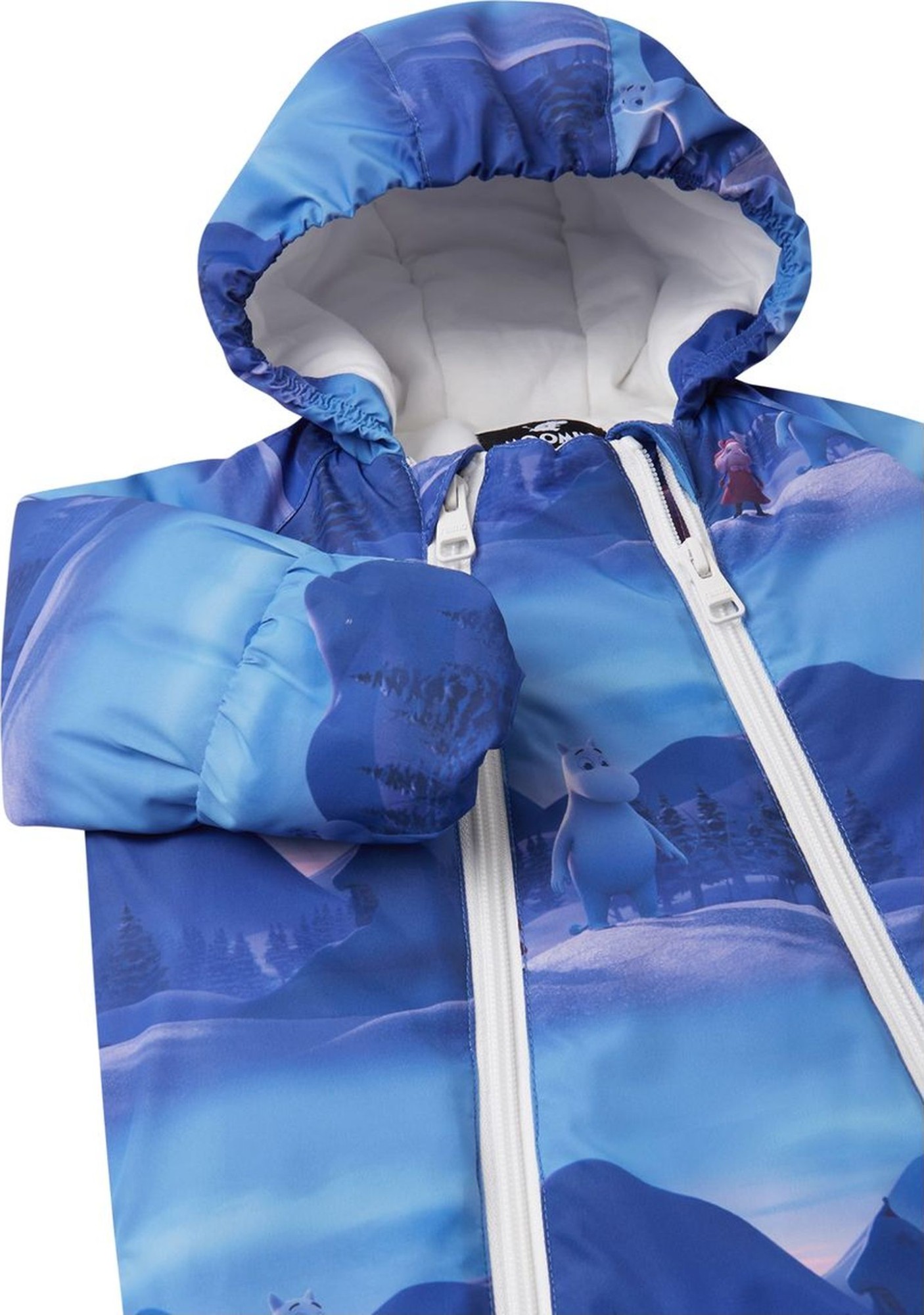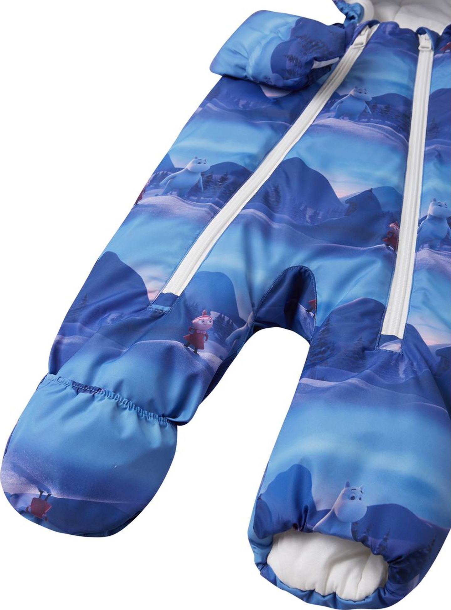 The material of this warm Moomin winter all-in-one suit for babies is water-repellent, windproof and breathable, and half of it is made from recycled polyester. Designed with care and the baby's comfort in mind, this piece has a lowered zip line so the soft and warm structure protects it from scratching the skin of your little one. Two long zippers for easy dressing and the fold over sleeve and leg ends protect the baby, so no need for extra accessories.